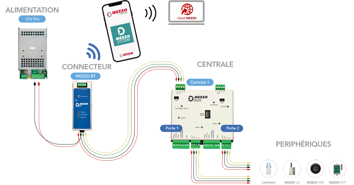 MEZZO BT est un connecteur sans fil qui utilise la technologie bluetooth pour dialoguer avec une ou plusieurs centrales MEZZO DUO via l’appli MEZZO SYSTEM. Cette gestion est opérée en réseau local via le BUS RS485, et peut supporter jusqu’à 15 centrales.