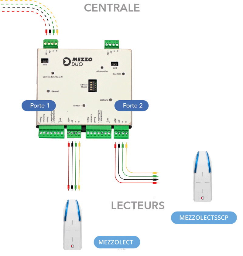 • Connexion par bus RS485 (se connecte sur le bus pour lecteur porte)