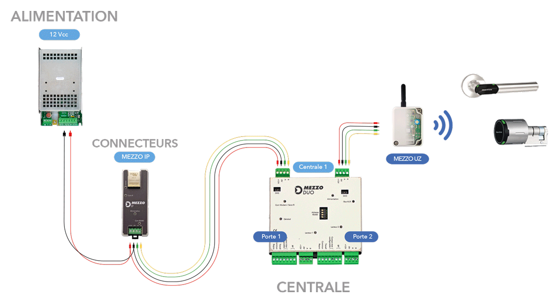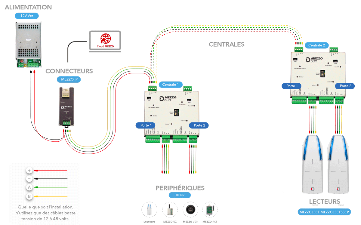 Parfaitement adapté pour les sites de petite à moyenne taille, il est possible de connecter jusqu’à 15 modules MEZZO DUO sur une même passerelle de communication (connecteurs).