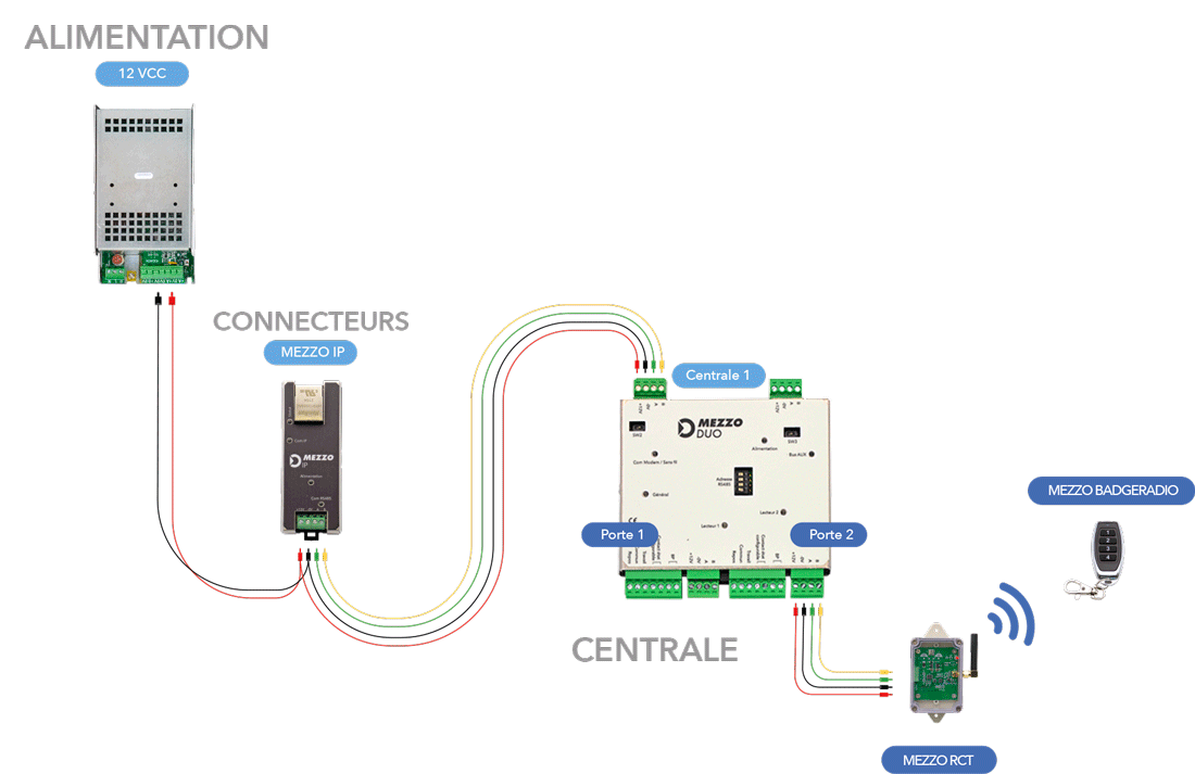 MEZZO RCT, est un module RS485 de gestion de télécommandes radio pour commander l’ouverture de portes via des télécommandes radio paramétrées comme des badges radio affectés aux utilisateurs.